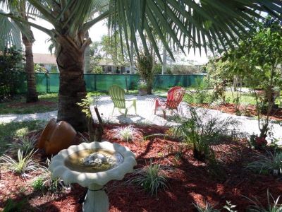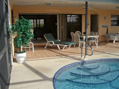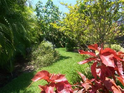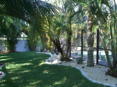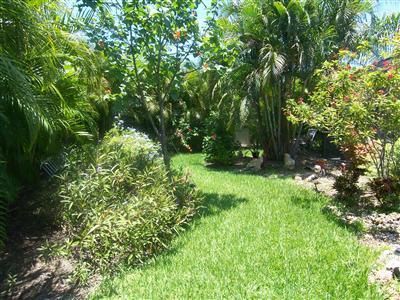 wie hier die hintere Gartenanlage mit Pflanzbereichen und einem Seitenblick auf den geschützten   Poolbereich Haus Sunrise echt tropisch und bestimmt uneinsehbar......